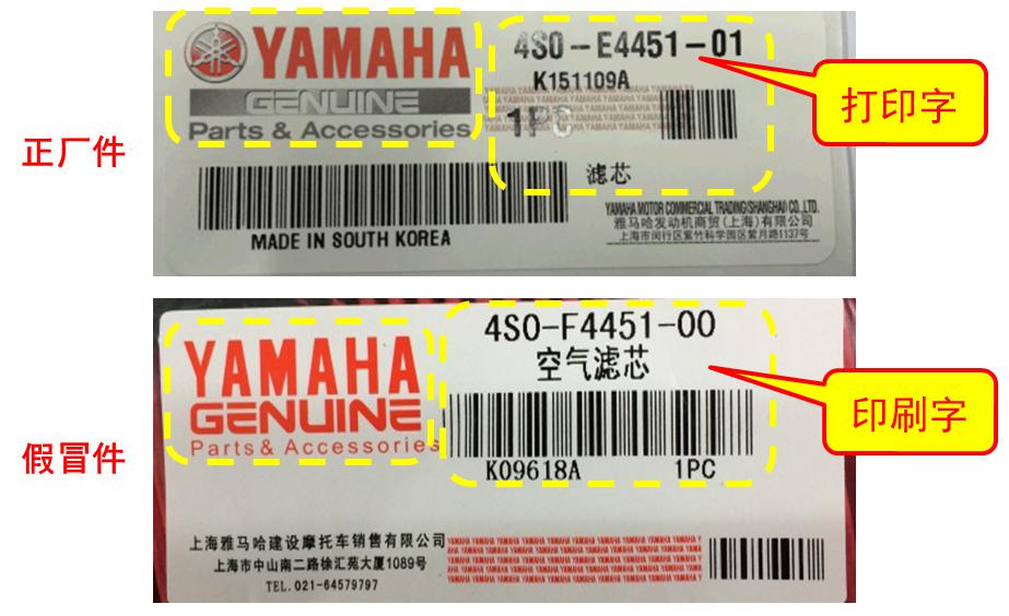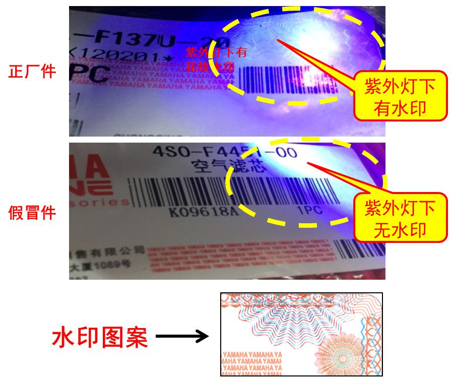 所销售的雅马哈纯正零配件,包装袋上贴有零配件标签。新版正品标签包含音叉标志、部品编号(名称)、出厂地、包装时间及数量(以打印方式)。利用紫外线灯照射,可观察到标签周围防伪的花纹水印