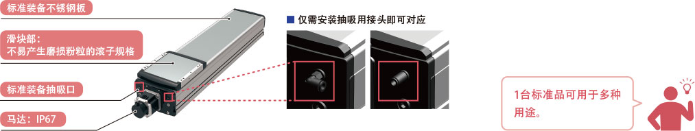 无马达单轴执行器,具有高精度、高耐用性和清洁规格的特征。 它也适用于长距离搬运。