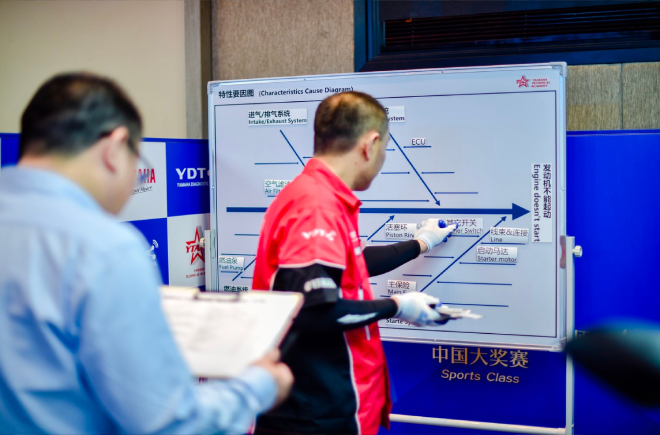 决赛另一内容则是车辆故障排除,更加考验选手的能力。在有限的时间内,选手们需要迅速定位故障并成功排除。尽管压力如影随形,但他们沉稳冷静,熟练运用 YDT 设备,对每一个可能存在问题的部件进行反复检查调试,力求将车辆恢复至优良状态。